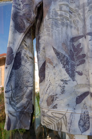 The STAR pieces of the winter collection are definitely the wool pieces. Vintage wool garments are repurposed with (primarily) eucalyptus trees, which have the unique ability to print red and orange colors exclusively on protein fabrics. The most vilified plant in the list becomes the most intersting in the studio. Keep your eye out for these classic ecoprint designs in the Winter collection.