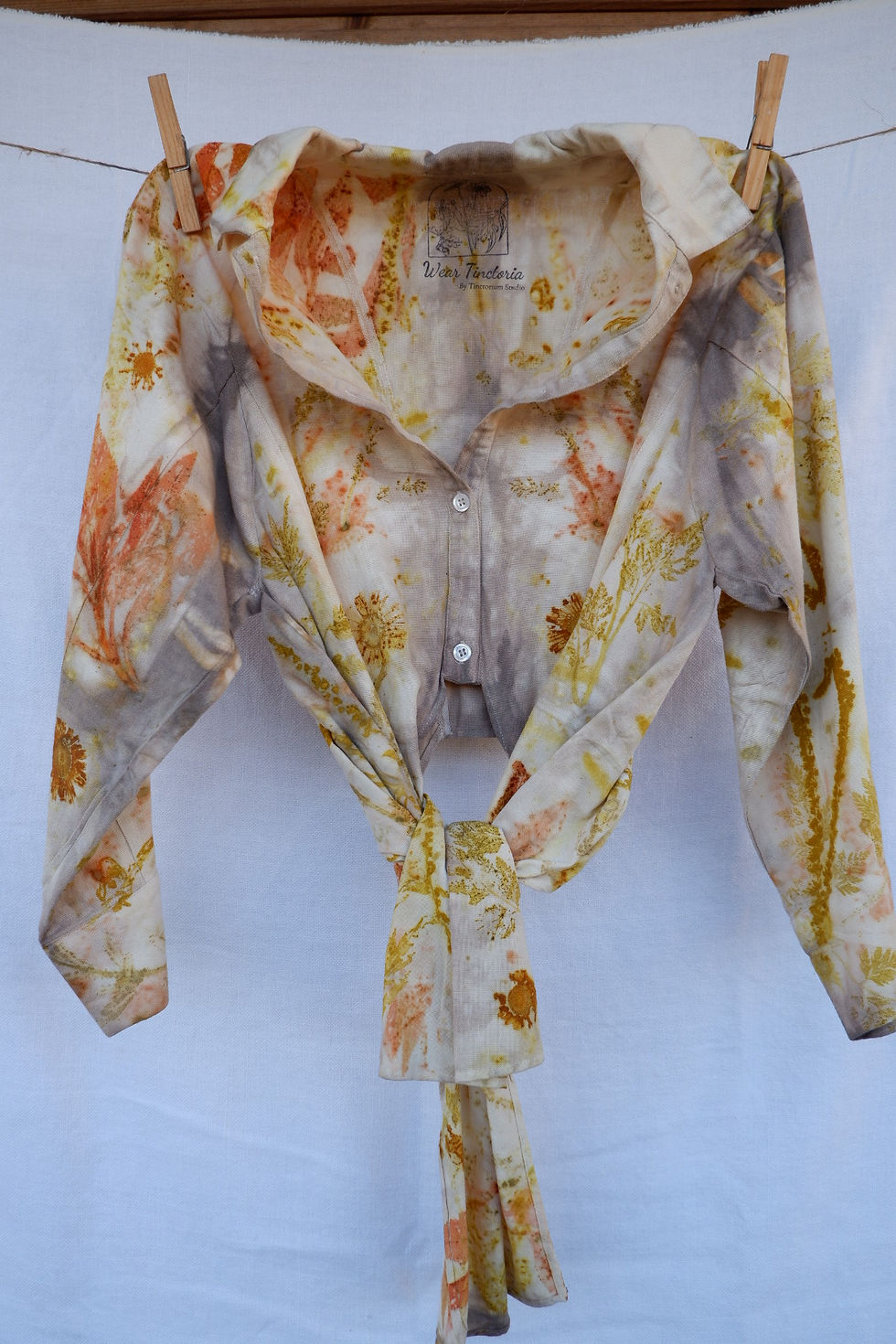 As peças Wear Tinctorium são tingidas com plantas locais, abundantes na estação — exclusivamente aquelas que eu consigo cultivar de forma regenerativa ou coletar de forma responsável. Seguindo uma lógica sazonal, cada peça se torna um reflexo do ambiente natural, permitindo que use o seu próprio ambiente. Todas as peças têm uma etiqueta com as plantas usadas para criar o padrão, e convido você a aprender mais sobre elas no journal.